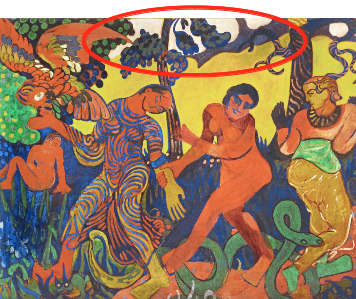 Enfin, les peintres ne souhaitent représenter que des éléments utiles dans leurs tableaux et il peut donc arriver qu'ils laissent des trous blancs dans les tableaux. Cela signifie qu'ils n'ont pas trouvé utile de remplir cet emplacement parce que cela n'aurait rien apporté de plus. On retrouve ainsi des espaces vides en haut de La danse, entre les feuilles des arbres, sur l'image ci-dessous. En effet, ces espaces vides ne sont pas très dérangeants et si l'artiste s'était obligé à les peindre, ils auraient peut-être alourdi la peinture et nous auraient empêchés de voir le sens profond de ce tableau. Ces espaces vides ne sont pas possibles en photographie car on ne peut pas ne pas photographier certains éléments d'un paysage. Sur ce point là, la peinture a donc bien réussi à dépasser la photographie argentique.